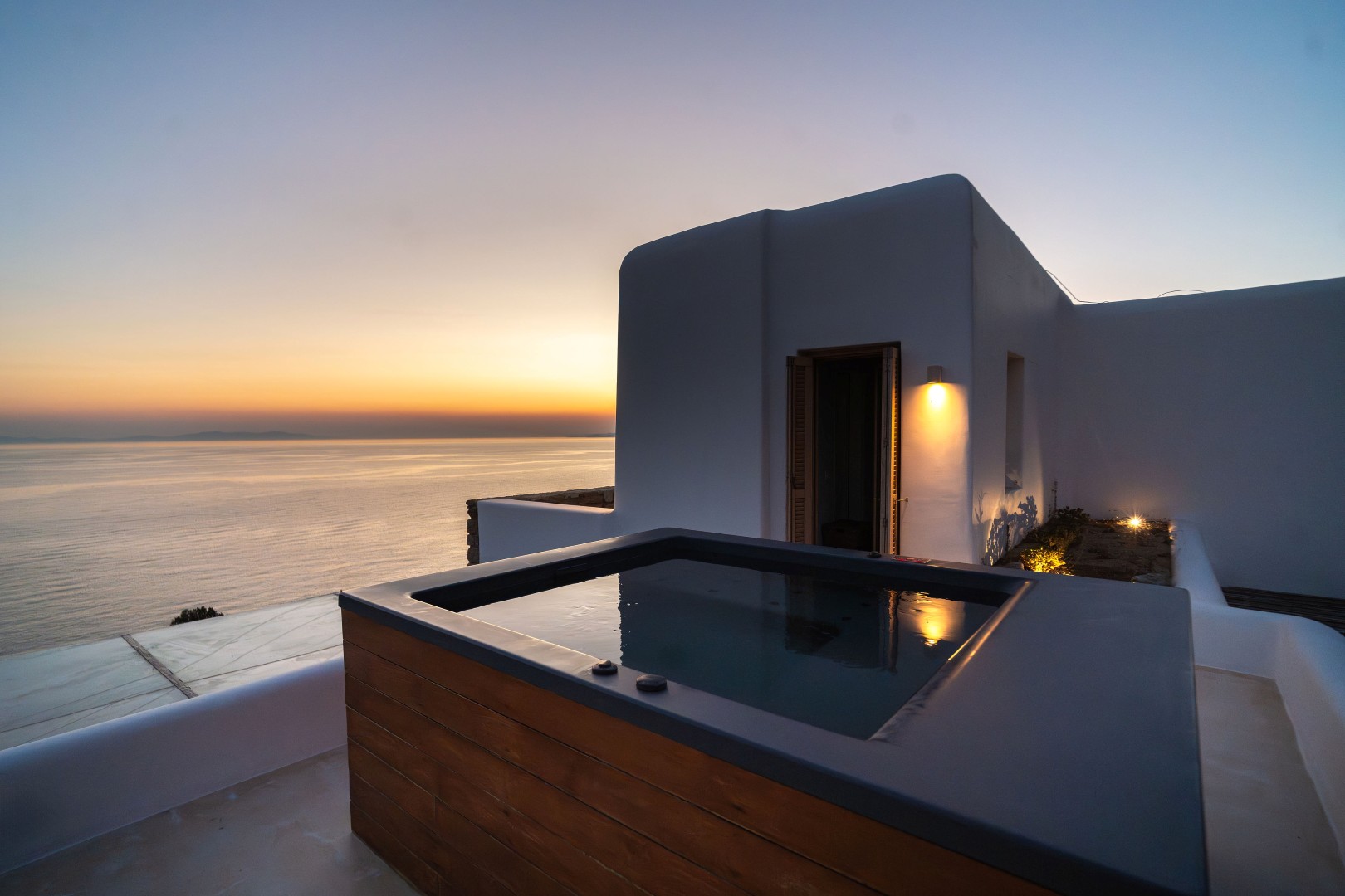 Outdoor living is a key highlight of Villa Cavo Sunset. The property features an impressive 4,000 square meters of outdoor space. As a result, guests can enjoy privacy, freedom, and uninterrupted views of the Aegean Sea. The villa includes three swimming pools and a relaxing Jacuzzi, creating multiple areas for leisure throughout the day.