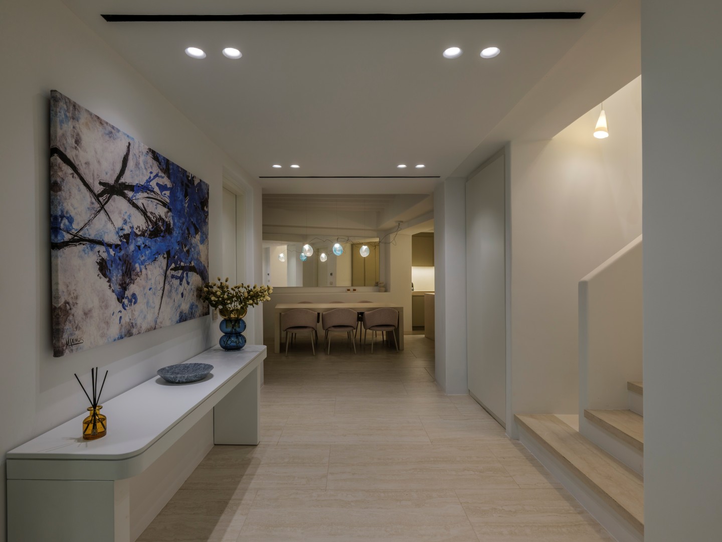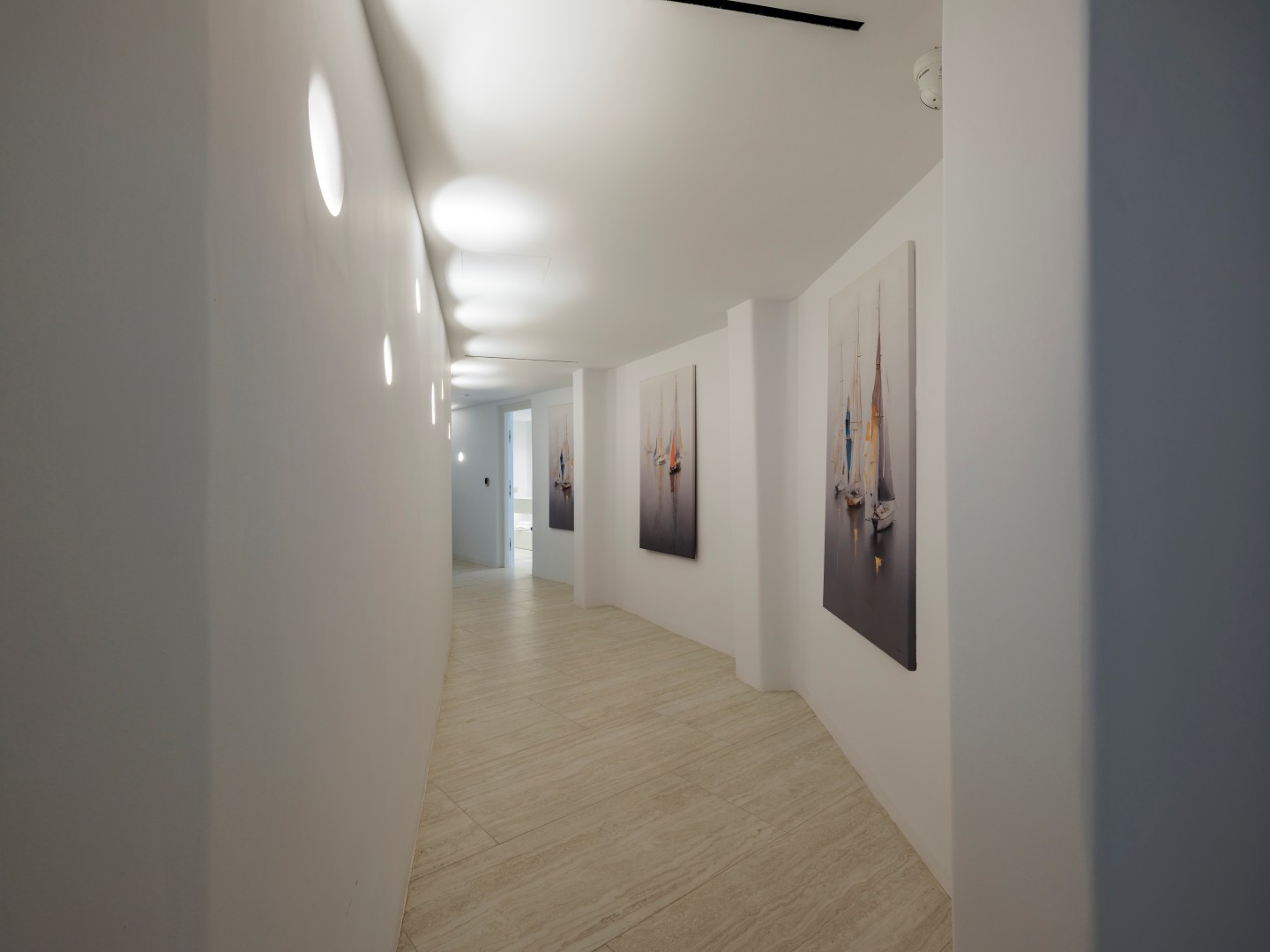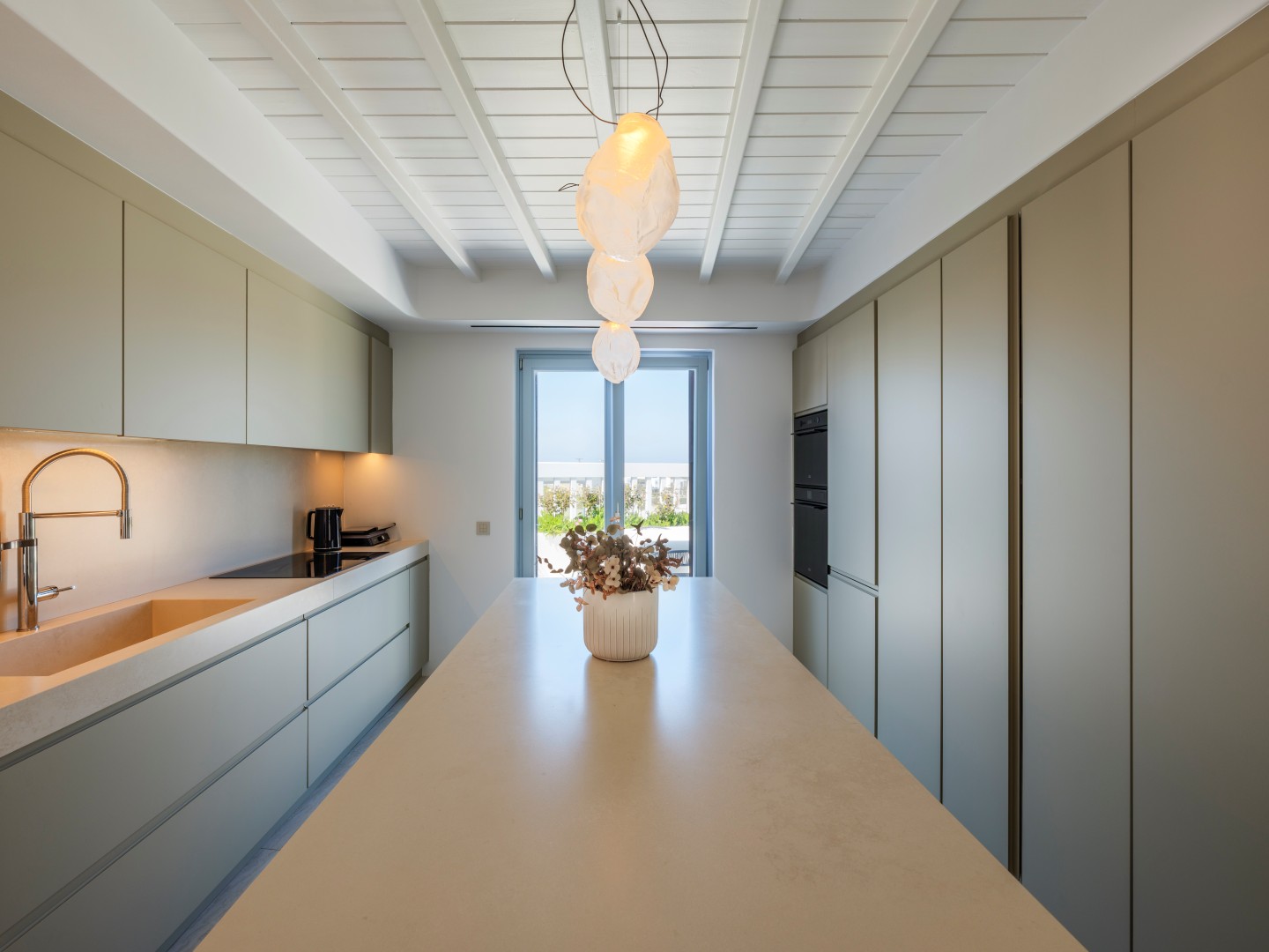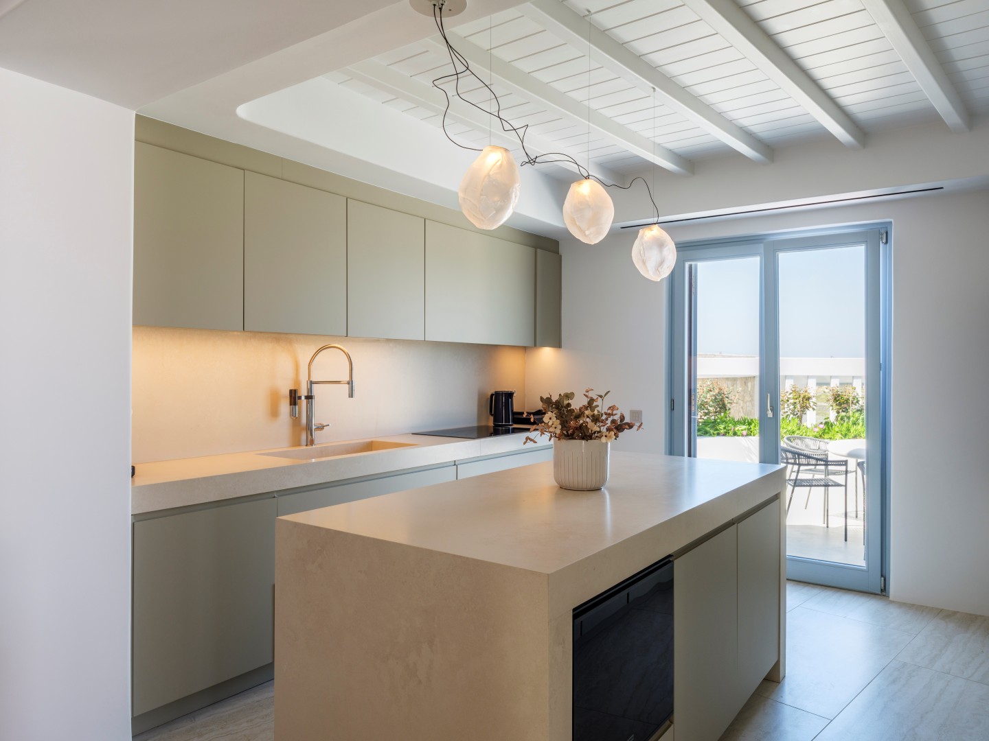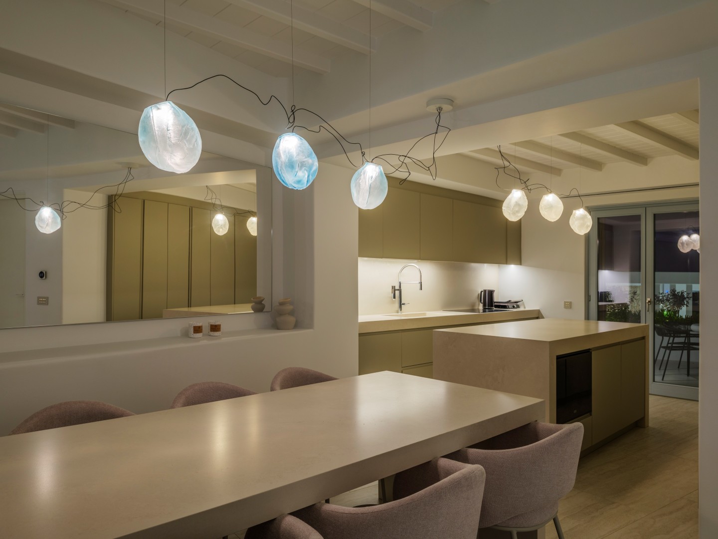 On the ground floor, guests enter a bright open-plan living area. At the same time, the elegant lounge connects seamlessly with the outdoor spaces. Furthermore, the fully equipped designer kitchen features iconic Bocci lighting and is suitable for private chef services. Additionally, one ensuite bedroom is located on this level.