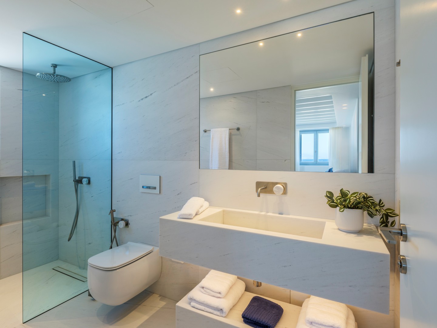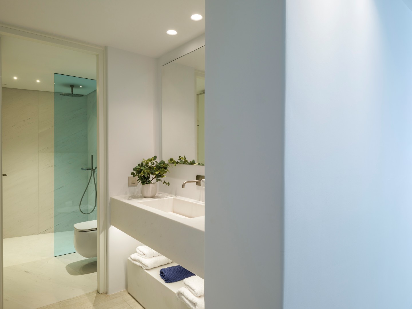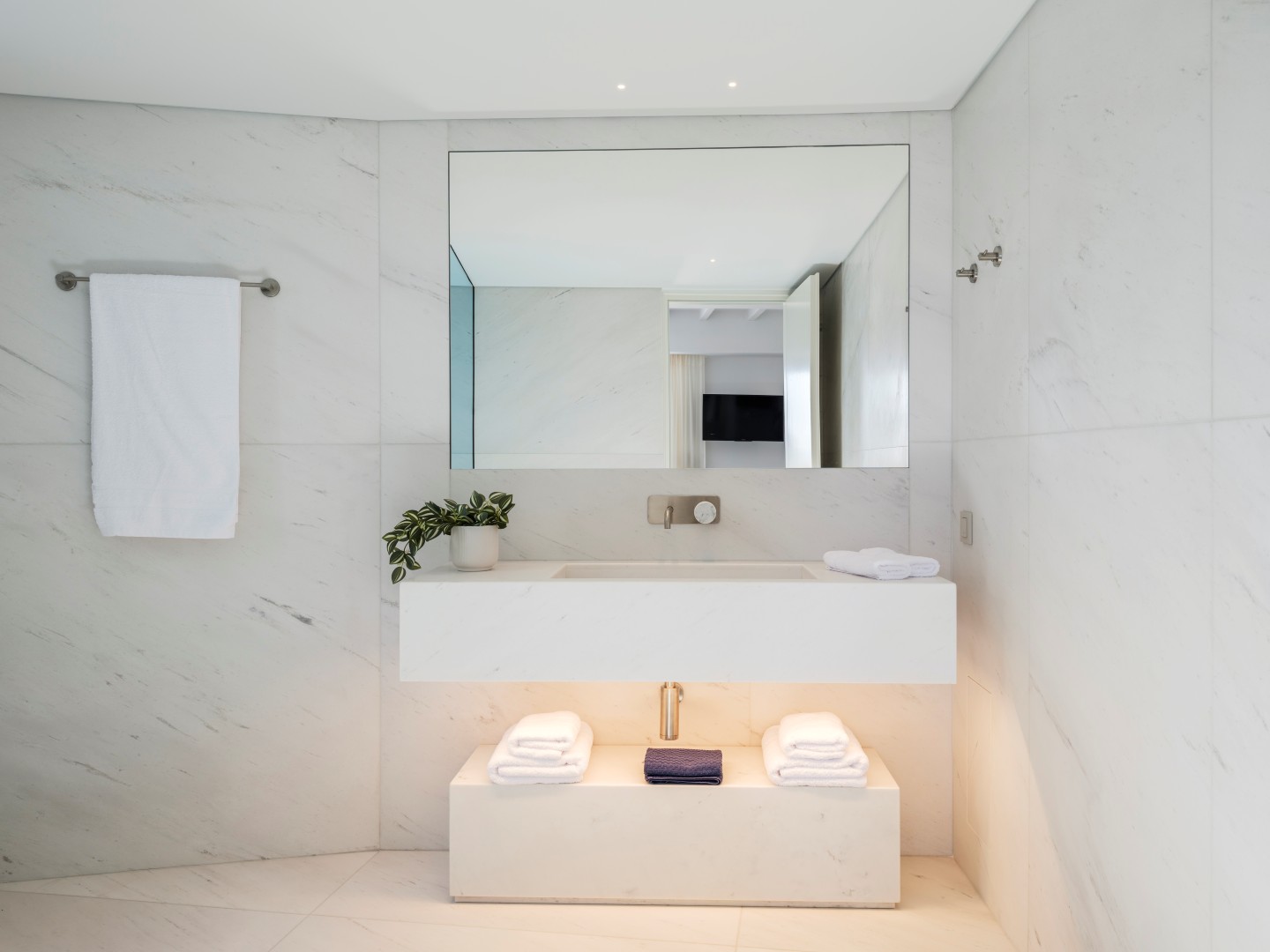 The main villa features six ensuite bedrooms with refined marble bathrooms. Moreover, all bedrooms are designed with premium materials and high-quality furnishings. In addition, the villa offers six main beds and three Coco-Mat single sofa beds.